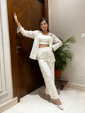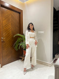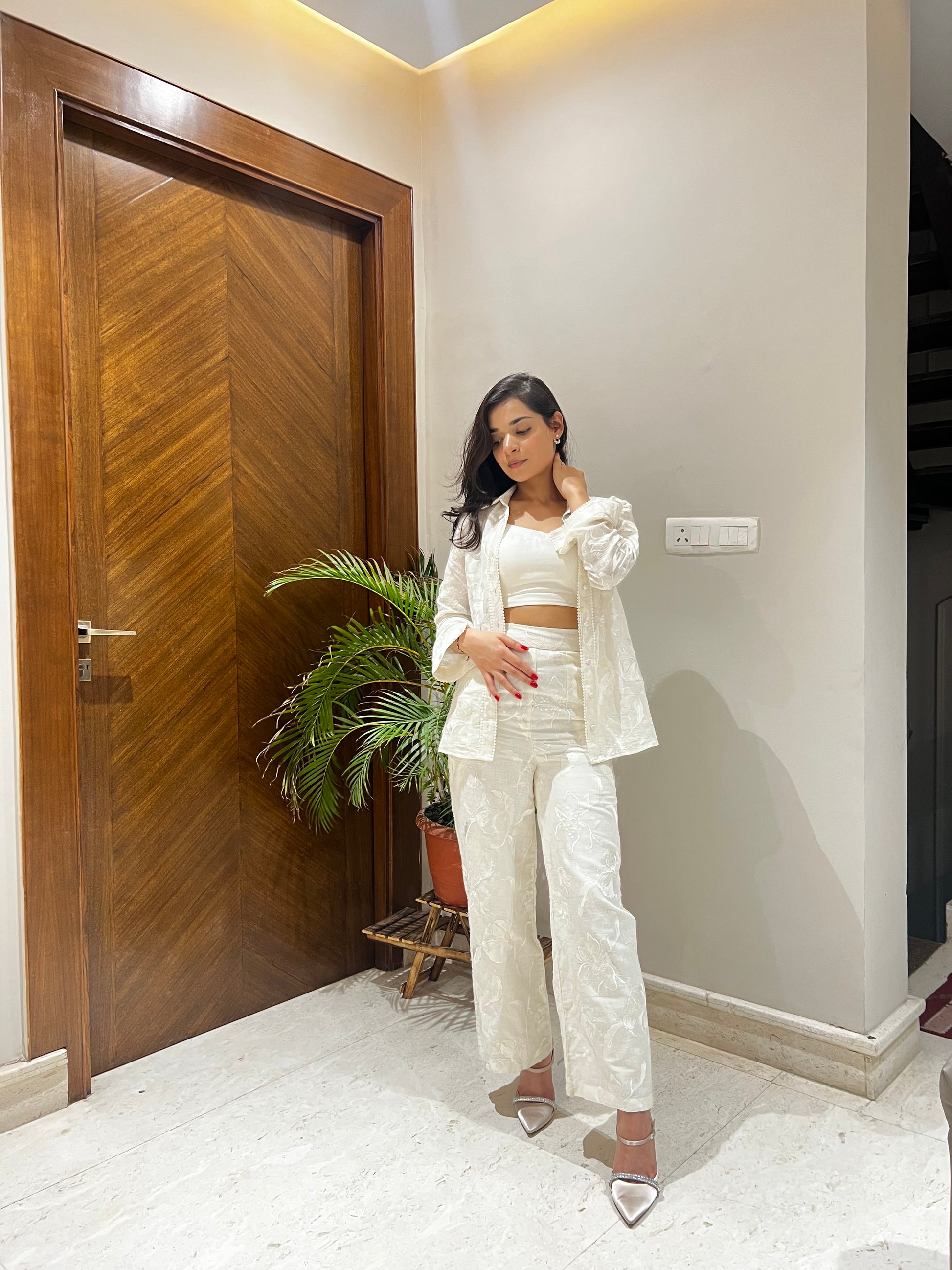 The Carnation Coord Set, crafted in embroidered white linen, exudes timeless elegance with a touch of modern flair. The set features a beautifully embroidered shirt adorned with delicate lacework, layered over a matching bralette for an effortlessly chic look. Paired with tailored linen pants, this ensemble strikes the perfect balance between sophistication and ease, making it a versatile choice for daytime gatherings or understated evening affairs.