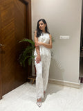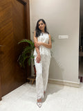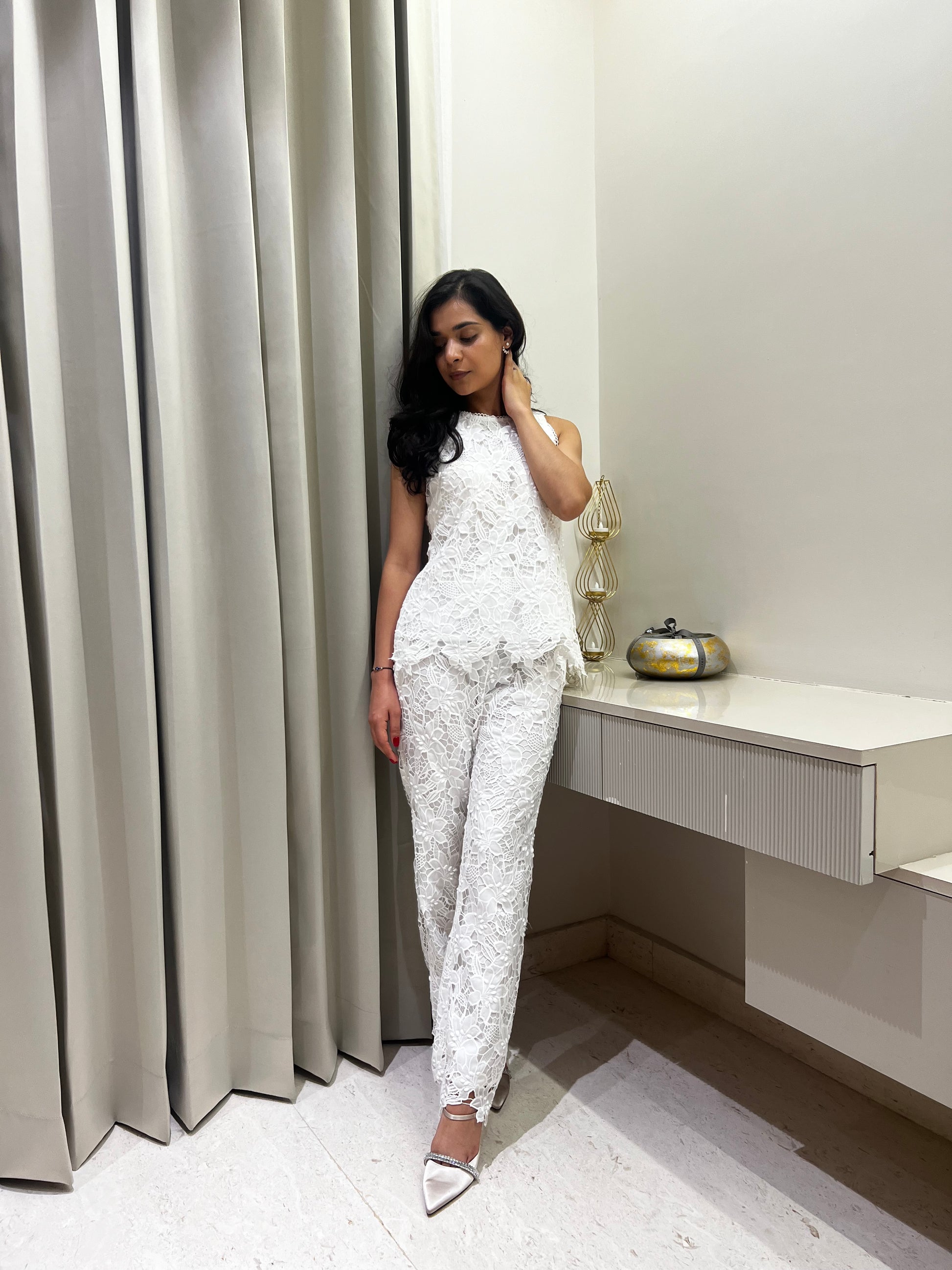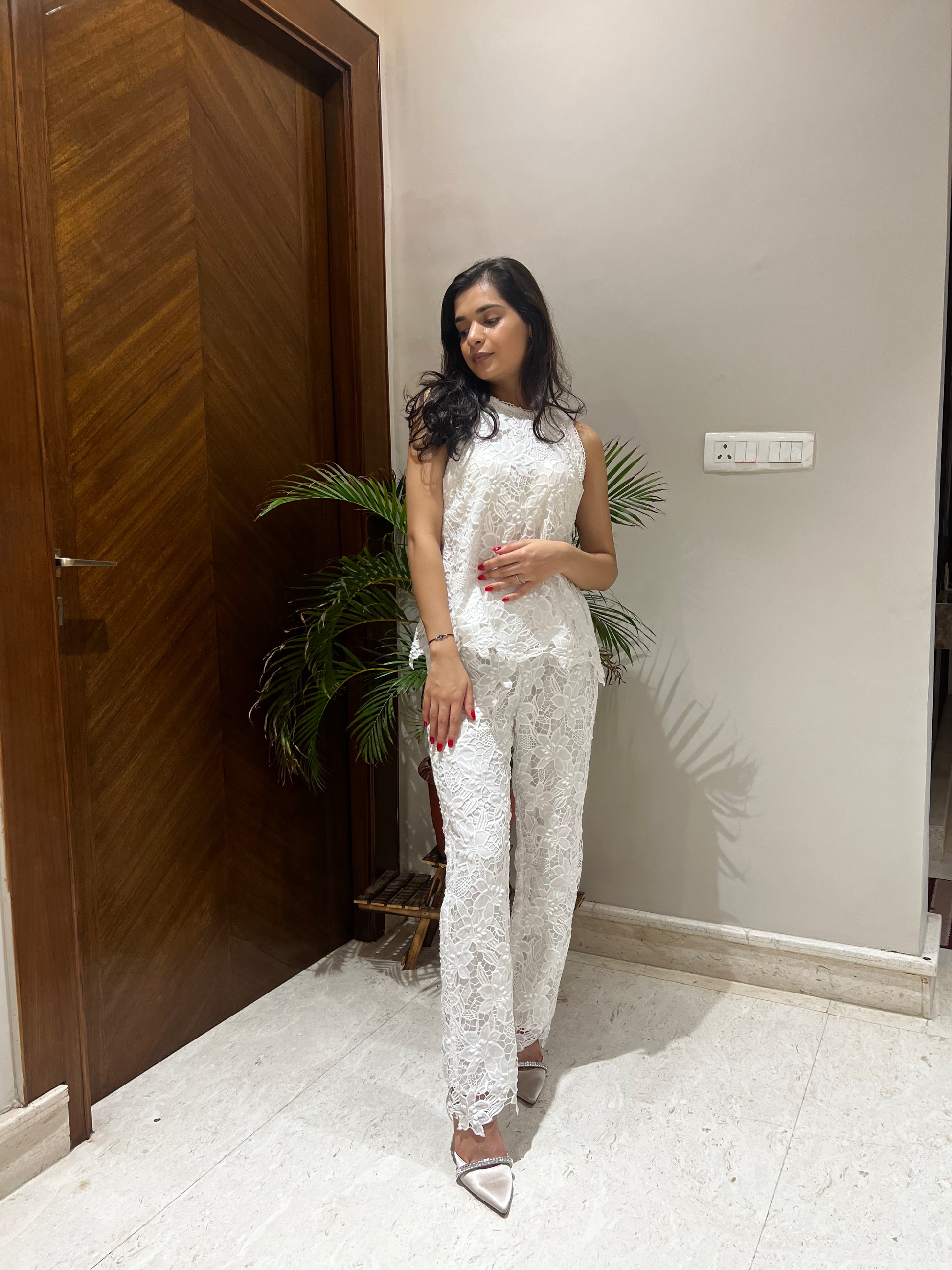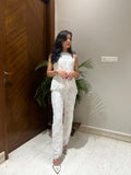 The Julia Coord Set is a masterpiece in white cutwork crepe, combining contemporary elegance with intricate craftsmanship. The chic white top is designed with delicate cutwork details, perfectly complemented by matching pants featuring scalloped edges for a refined finish. This versatile ensemble is effortlessly stylish, making it an ideal choice for everything from daytime soirees to evening celebrations.